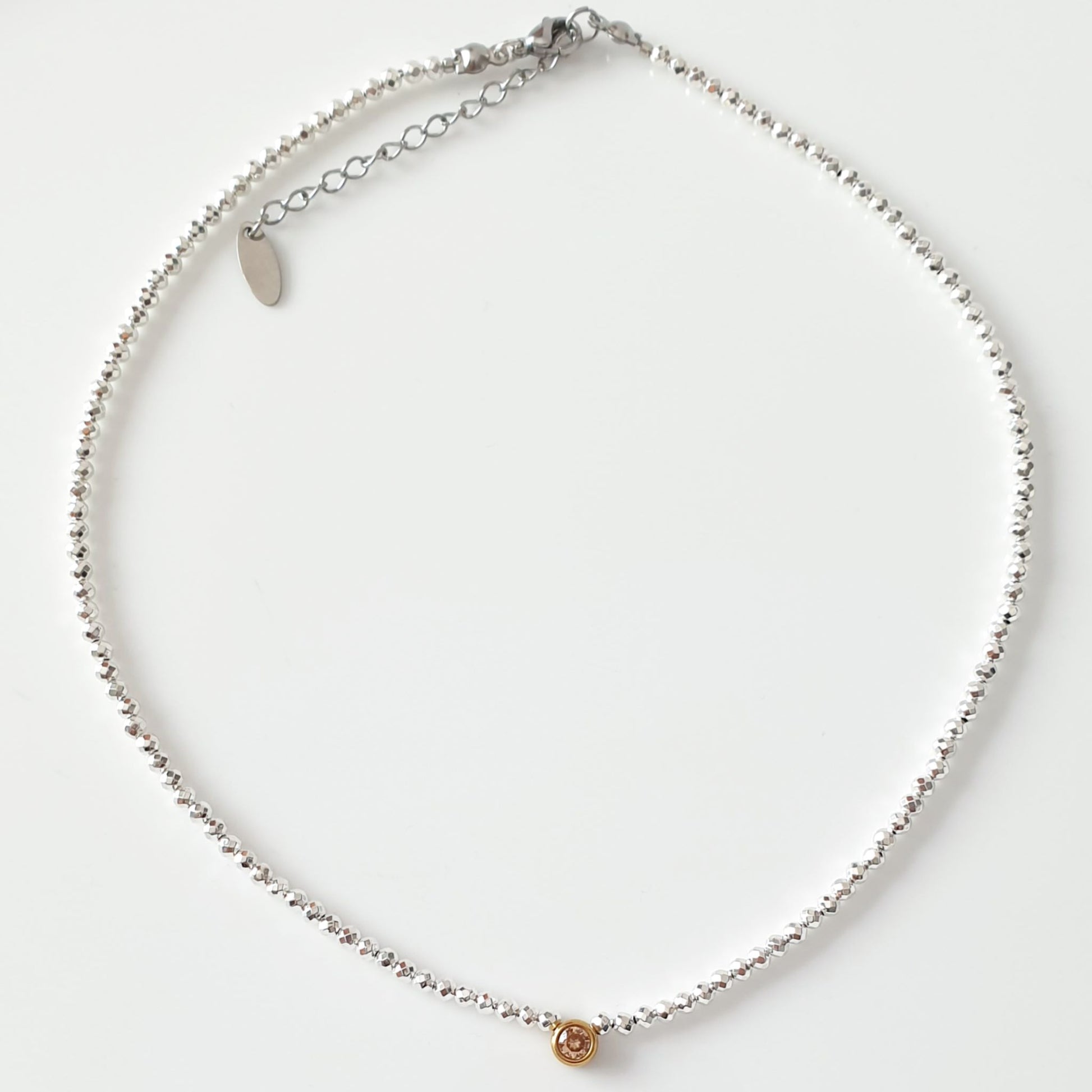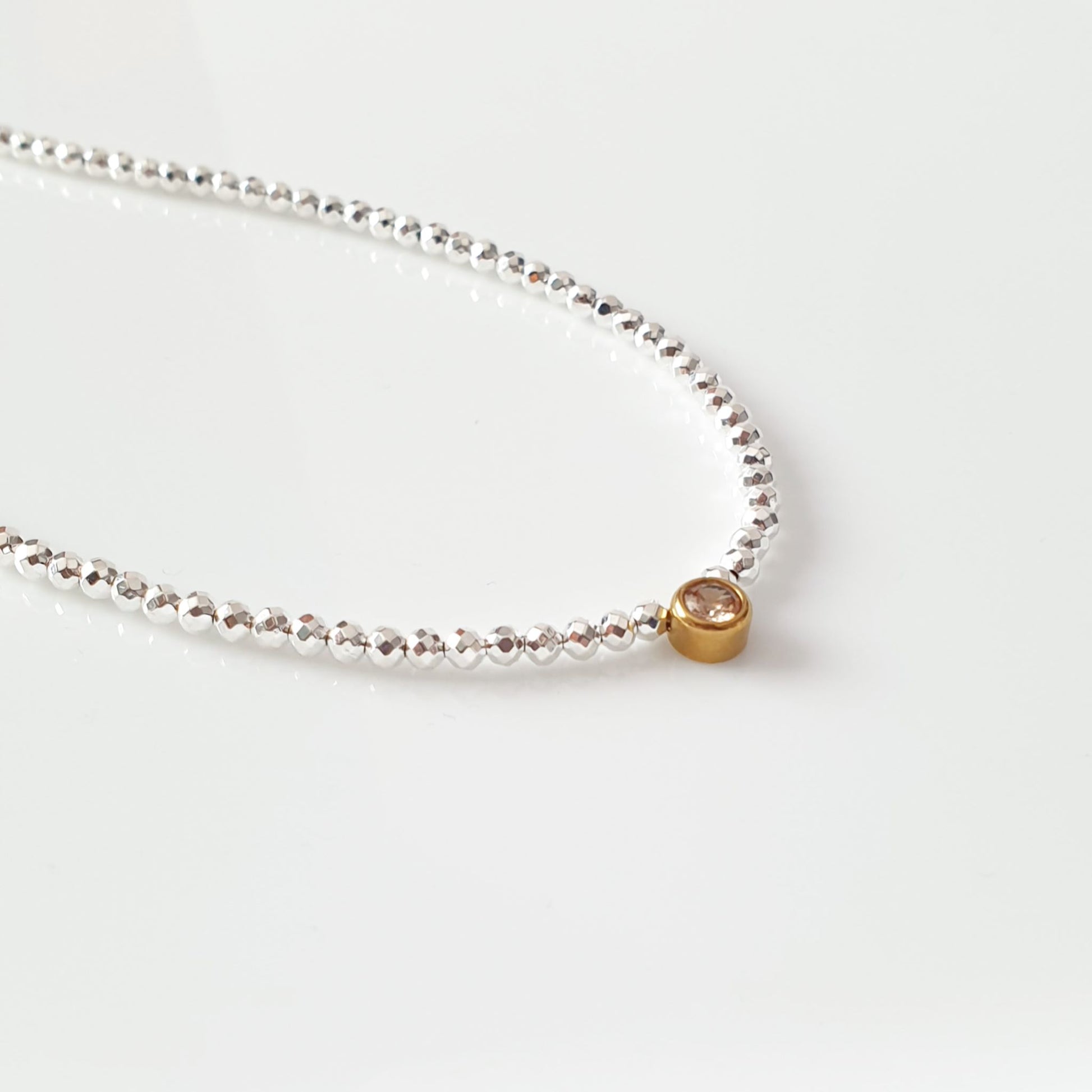 Χειροποίητο κολιέ, φτιαγμένο απο επιμεταλλωμένο αιματίτη που δίνει απίστευτη λάμψη, διακοσμημένο με μικρό διαμαντάκι σε ροζ χρώμα.